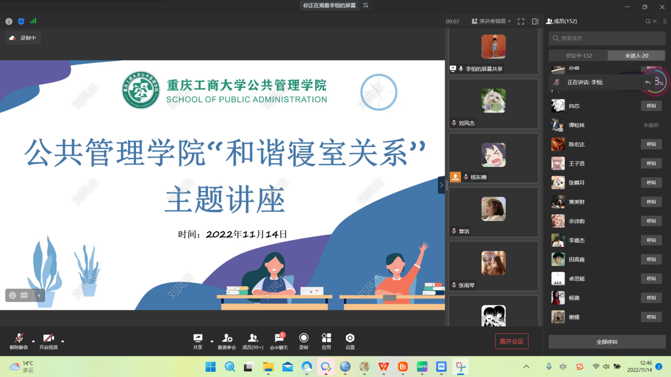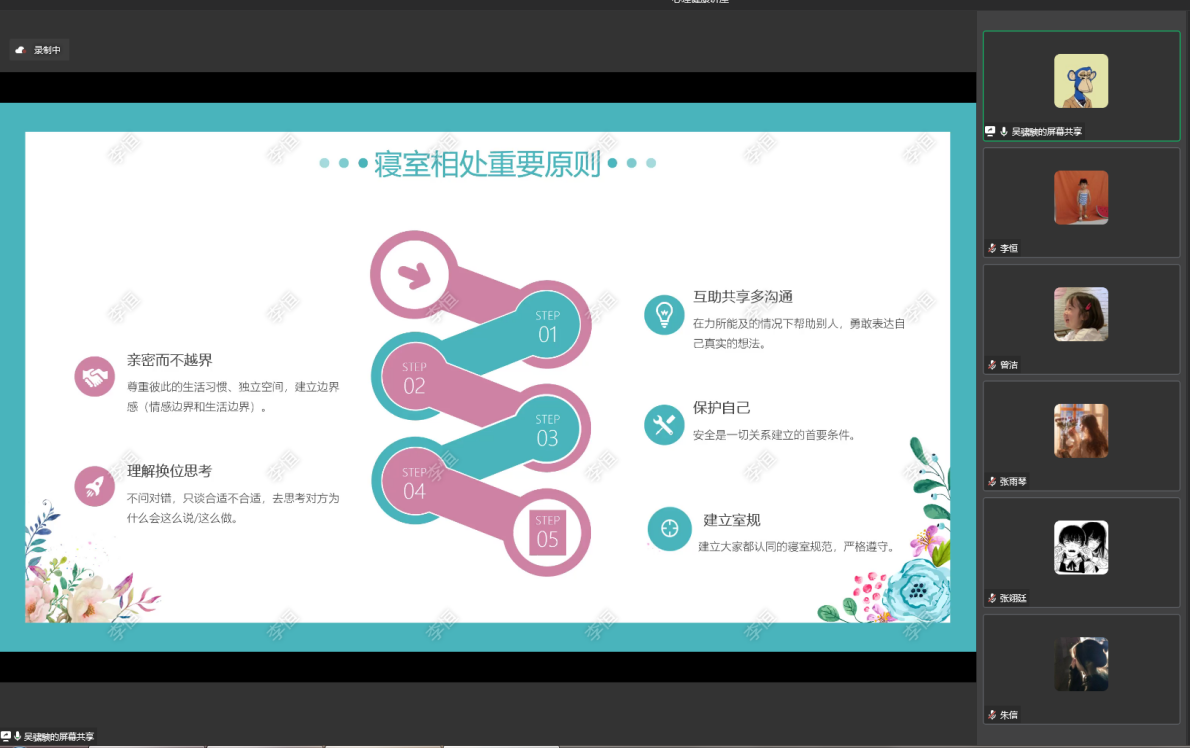 当前位置: 首页 >> 联系我们 >> 正文 英国365上市公司举办主题讲座“和谐寝室关系” 时间:2022年11月14日 17:10 来源:英国365上市公司 李恒 为帮助在校老员工更好地处理宿舍人际交往问题,营造温馨和谐的宿舍氛围, 2022年11月14日中午,英国365上市公司线上举办了“和谐寝室关系”主题讲座,本次讲座邀请公司心理健康中心专职咨询师吴骕騻作为主讲人,公司党委副书记谢书楠、全体辅导员及260名员工次参与了本次讲座。 讲座在谢书楠副书记的致辞中拉开帷幕,她首先肯定了本次活动的意义,希望同学们能将讲座中学到的沟通技巧从宿舍关系外延拓展到日常人际关系中。主讲人吴骕騻老师主要从常见的寝室矛盾、正确看待寝室关系、如何解决寝室矛盾和寝室相处的重要原则四个部分出发。吴老师在讲座中给同学们分享了许多宿舍关系的处理和人际交往的技巧,虽然都是身边的小事,但却蕴含着为人处世的智慧,并给同学们提供了一些处理寝室人际关系的方法,同学们收获颇丰。 此次讲座对于员工缓解疫情形势下的不良情绪、引导宿舍关系正向发展提供了更有针对性的指导,同时强化了宿舍长、楼层长的责任意识,促进了公司宿舍管理以及疫情防控常态化管理机制的进一步健全。 上一条:凝心聚力启新程:公司召开2023年第一次员工工作例会 下一条:喜报:公司获评公司2022年老员工暑期“三下乡”社会实践活动先进集体 【关闭】