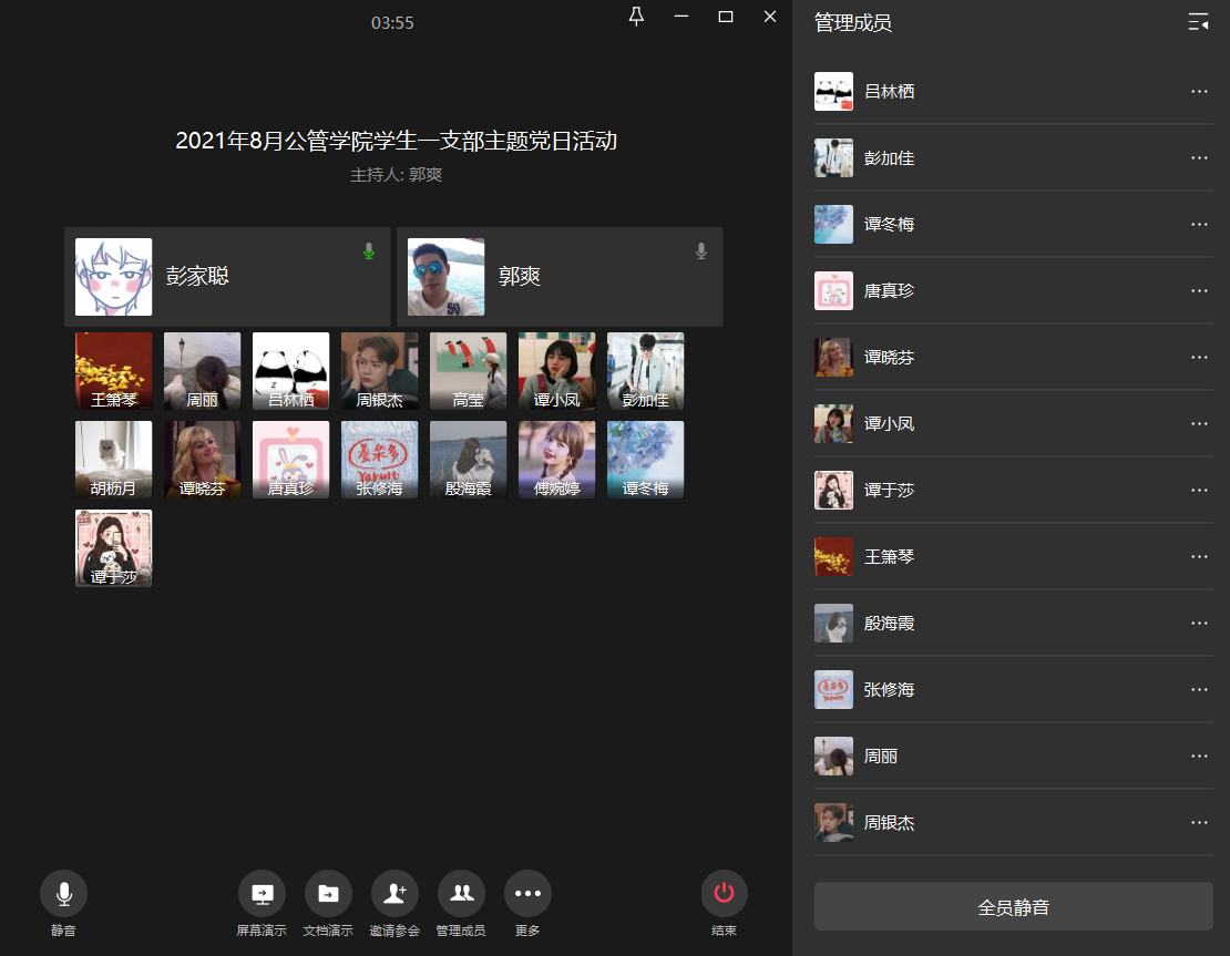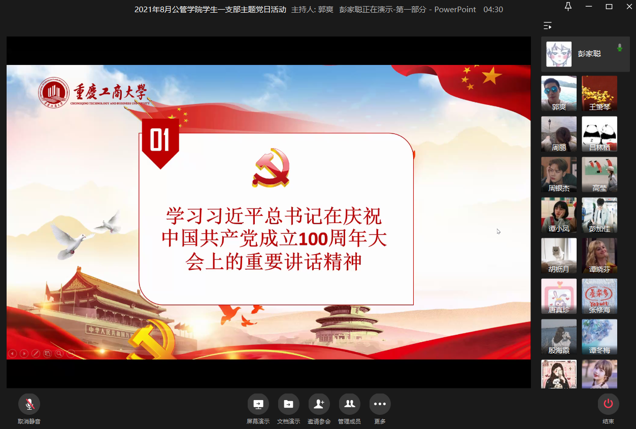 当前位置: 首页 >> 党建双创 >> 主题党日活动 >> 正文 英国365上市公司员工一支部2021年8月主题党日活动顺利召开 时间:2021年08月21日 09:53 来源:英国365上市公司 郭爽 2021年8月20日15时,英国365上市公司员工一支部在企业微信召开了线上八月主题党日活动。此次会议由员工一党支部书记郭爽同志主持,一支部全体党员同志参加。 会议主要是由彭家聪、谭冬梅、唐真珍、吕林栖四位同志领学相关文件。其中,彭家聪同志领学了《学习习近平总书记在庆祝中国共产党成立100周年大会上的重要讲话精神》、《习近平在西藏考察时的重要讲话精神》;谭冬梅同志领学了习近平在亚太经合组织领导人非正式会议上的讲话——《团结合作抗疫,引领经济复苏》、习近平在中国共产党与世界政党领导人峰会上的主旨讲话——《加强政党合作,共谋人民幸福》;唐真珍同志领学了党史的相关内容,包括了习近平总书记讲话、指示中有关学史明理、学史增信、学史崇德、学史力行内容的节录、为百年大党千秋伟业提供坚强保证——中国共产党组织建设的辉煌成就与宝贵经验、中组部召开抓党建促乡村振兴电视电话会议精神等三部分的内容;吕林栖同志领学了《关于在防汛救灾中充分发挥基层党组织战斗堡垒作用和广大党员先锋模范作用通知》、《向王红旭同志学习的通知》。 领学结束后,支部书记郭爽同志谈到河南洪灾和国内新冠肺炎疫情反弹,作为党员同志,应该积极发挥党员的先锋模范作用,积极给身边同学提供帮助,携手度过难关,同时,郭爽同志提到马上新学期要开学了,各位党员同志应该积极主动帮助班委督促班上同学按时返校并遵守公司相关疫情防疫及其他规定。 通过此次主题党日活动,党员同志们进一步了解了党近期的系列动态,更加深入学习党史,学习先进精神,更加自觉的树立起党员的先锋模范作用。 上一条:英国365上市公司员工第二党支部2021年9月组织生活顺利举行 下一条:英国365上市公司员工二支部2021年8月主题党日活动顺利召开 【关闭】