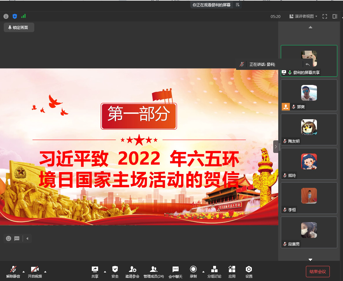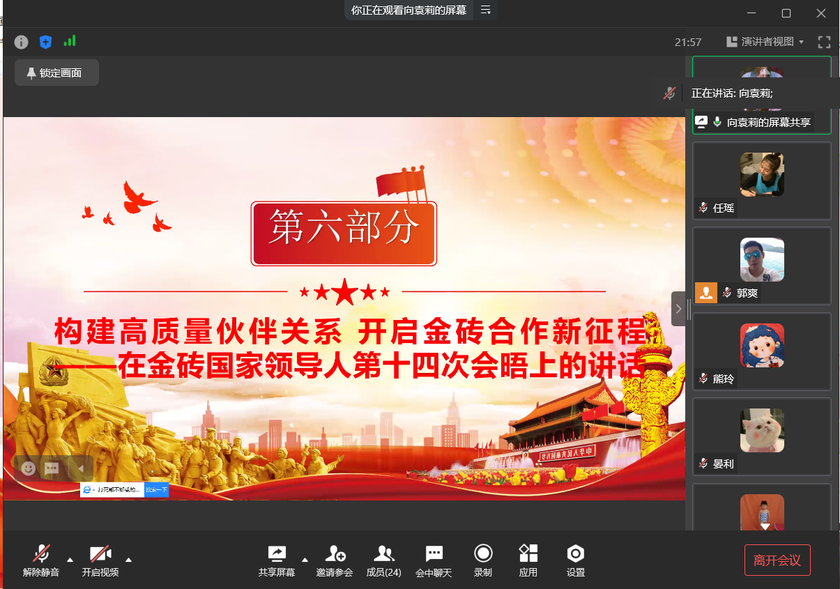当前位置: 首页 >> 党建双创 >> 主题党日活动 >> 正文 英国365上市公司员工第一党支部召开2022年7月主题党日活动 时间:2022年07月15日 08:54 来源:英国365上市公司 郭爽 2022年7月14日,英国365上市公司员工第一党支部在线上企业微信召开7月主题党日活动,本次活动应到23人,实到23人,本次活动由支部书记郭爽同志主持。 会议首先讨论通过了积极分子白斌洋、邹凡一心同学放弃积极分子身份的申请,以及讨论通过了入党申请人孔佑容、夏倩倩、何旭、谭深坳、彭智、彭娟、万文银、王永顺、廖鑫、冉虹璐同学放弃入党申请人身份的申请。 讨论结束后,由19级晏利、向袁莉、任瑶、陶友明、严雪柔五位党员同志领学7月相关学习内容。其中晏利领学了关于《习近平致2022年六五环境日国家主场活动的贺信》、《习近平:在新的征程上奋力谱写四川发展新篇章》、《习近平主持十九届中共中央政治局第四十次集体学习》、《习近平主持中央全面深化改革委员会第二十六次会议》的内容,她指出希望全社会行动起来,做生态文明理念的积极传播者和模范践行者,身体力行、真抓实干,为子孙后代留下天蓝、地绿、水清的美丽家园。向袁莉领学了《习近平在金砖国家工商论坛开幕式上的主旨演讲》、《习近平在金砖国家领导人第十四次会晤上的讲话》、《习近平在全球发展高层对话会上的讲话》、《全球发展高层对话会主席声明》的内容,她指出我们要坚持开放包容,拆除一切阻碍生产力发展的藩篱,引导推动全球化健康发展。任瑶领学了《习近平在湖北武汉考察时的重要讲话精神》、《习近平在香港视察时的重要讲话精神》、《习近平在庆祝香港回归祖国25周年大会暨香港特别行政区第六届政府就职典礼上的讲话》、《习近平总书记重要文章《坚定不移走中国人权发展道路》》的内容,她指出完善治理体系、提高治理能力、增强治理效能,是把香港特别行政区建设好、发展好的迫切需要。陶友明领学了《习近平总重要文章《更好把握和运用党的百年奋斗历史经验》》、《习近平谈治国理政第四卷》、《习近平同志《论“三农”工作》》的内容,他指出坚持用马克思主义之“矢”去射新时代中国之“的”,继续推进马克思主义基本原理同中国具体实际相结合、同中华优秀传统文化相结合,使马克思主义呈现出更多中国特色、中国风格、中国气派,续写马克思主义中国化时代化新篇章。严雪柔领学了《习近平同志《论党的青年工作》》、《《习近平经济思想学习纲要》》、《中国共产党的一百年》、《重庆市党史学习教育领导小组印发《贯彻落实〈关于推动党史学习教育常态化长效化的意见〉的措施》》的内容,她指出在新的征程上,如何更好把青年团结起来、组织起来、动员起来,为实现第二个百年奋斗目标、实现中华民族伟大复兴的中国梦而奋斗,是新时代中国青年运动和青年工作必须回答的重大课题。领学完毕后,与会党员同志展开了讨论。李新玥同志说:“要把社会主义核心价值观的基本内容熟记熟背,融化在心灵里,铭刻在脑子中,结合学习和生活等实践不断加深理解。要学习英雄人物、先进人物、美好事物,在学习中养成好的思想品德追求,要从自己做起、从身边做起、从小事做起。”喻薇同志说:“当代青年要树立与时代主题同心同向的理想信念,勇于担当时代赋予的历史责任,以良好的品德去赢得人生和事业的成就 。” 最后,支部书记郭爽同志作总结讲话。他谈到,昨天江北区新增一例市外来渝新冠肺炎确诊病例,他提醒同学们要加强疫情防范意识,做好防护工作。此外,近日天气炎热,同志们要注意避暑。他还提出,当前很多大三的党员同志都在准备考研、考公以及实习,身体是革命的本钱,要达到目标,身体健康是基础。在暑期,所有同志都要充分利用暑期相对轻松的时间来仔细思考未来的发展方向,作好个人的人生规划。 上一条:英国365上市公司员工第一党支部召开8月份主题党日活动 下一条:英国365上市公司员工第一党支部开展6月份第二次主题党日活动 【关闭】