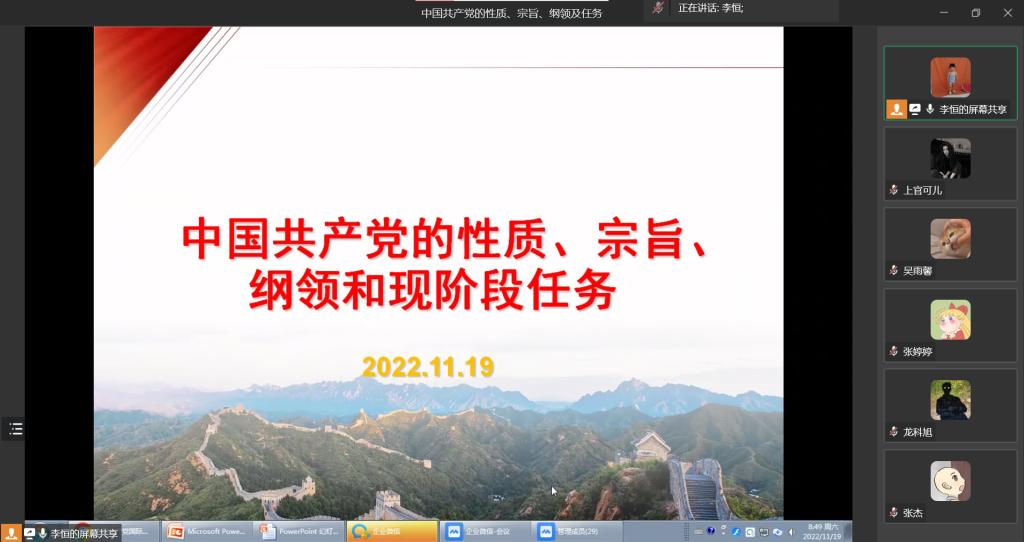 当前位置: 首页 >> 党建双创 >> 主题党日活动 >> 正文 英国365上市公司2022年11月入党积极分子培训班胜利闭幕 时间:2022年11月19日 19:08 来源:英国365上市公司 郭爽 2022年11月19日,中共英国365上市公司委员会党校英国365上市公司分党校2022年11月入党积极分子培训班胜利落幕。为进一步做好入党积极分子培育工作,加深教育学员对党的认识,端正入党动机,坚定入党决心,中共英国365上市公司委员会党校英国365上市公司分党校于11月18日至19日成功举办2022年第二期入党积极分子专题培训班。培训班由公司党委副书记谢书楠、英国365上市公司教工二支部书记赵伟、英国365上市公司员工一支部书记兼本次培训班班主任郭爽、英国365上市公司员工一支部李恒、英国365上市公司员工二支部书记蒋杰以及英国365上市公司员工二支部邓丽出席并担任主讲老师,全院共27名入党积极分子参加了培训。 开班仪式由蒋杰同志主持。她首先对参加本次培训班学员表示欢迎,并对同学们的发展和成长寄予深切希望。她强调了开展此次培训的重要意义,希望广大学员做到思想重视、勤于思考,认真学习相关材料,认真听取辅导报告,珍惜此次培训机会,争取最大收获。 此次培训班共分七讲,第一讲由公司教工二支部书记赵伟围绕深入学习党的二十大精神这一主线,从党的二十大召开的重要意义、新时代十年的伟大变革、马克思主义中国化时代化、中国式现代化、新时代新征程的使命任务五个方面展开讲授。第二讲由公司员工二支部书记蒋杰主讲,向同学们讲述了习近平新时代中国特色社会主义思想与中华民族伟大复兴这一专题。第三讲由公司党委副书记谢书楠主讲,详细地向同学们介绍了中国共产党的指导思想。第四讲由公司员工一支部李恒主讲,向同学们讲述了中国共产党的性质、宗旨、纲领和现阶段的任务。第五讲由公司员工二支部邓丽老师主讲,从民主集中制出发强调了中国共产党的组织原则和纪律。第六讲由公司员工一支部书记郭爽老师主讲,主要给同学们深入解读了中国共产党员。第七讲是集中观看专题节目——《榜样5》。 本次培训班旨在对入党积极分子进行培养教育,提升其理论知识水平和党性,培养合格的社会主义接班人。通过此次培训学习,学员们加深了对党的了解,增强了政治思想觉悟,提升了政治理论素养,坚定了理想信念,将踔厉奋发、勇毅前行,用实际行动积极向党组织靠拢,用优异成绩描绘大学阶段的人生答卷,用坚实基础和青年担当做新时代优秀老员工。希望全体积极分子在学习党课后,坚定不移听党话、跟党走,接受党组织的培养和教育,争取早日通过党组织的考验,成为一名光荣的共产党员。 上一条:【学习党的二十大精神】“学习党的二十大精神,立志做新时代好青年”知识竞赛圆满结束 下一条:英国365上市公司员工第一党支部召开11月份主题党日活动 【关闭】
