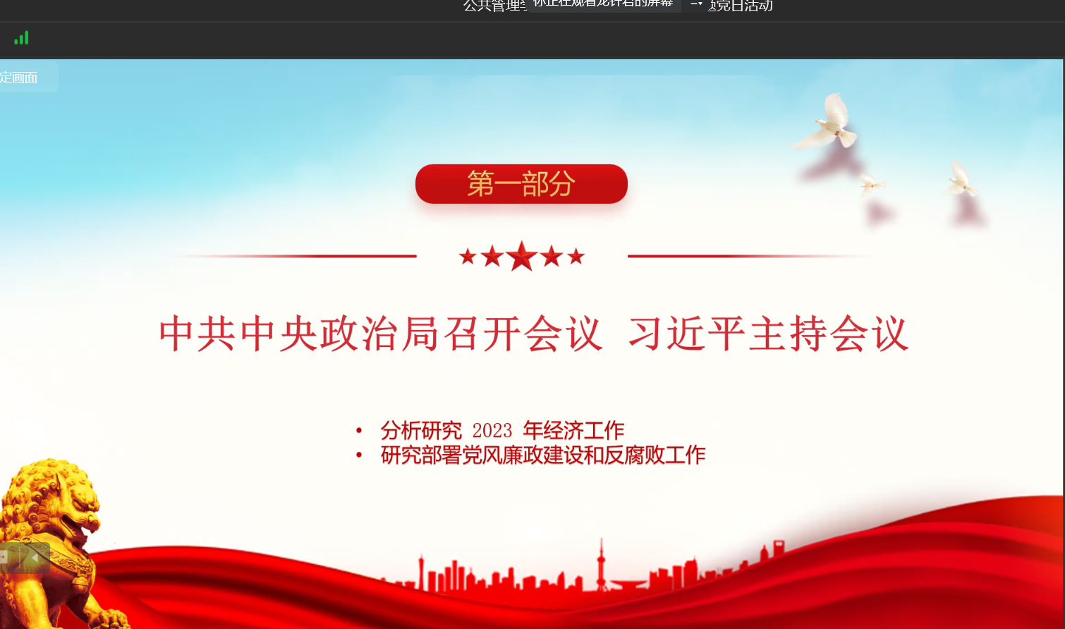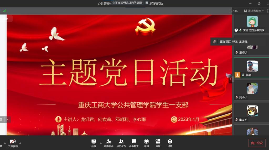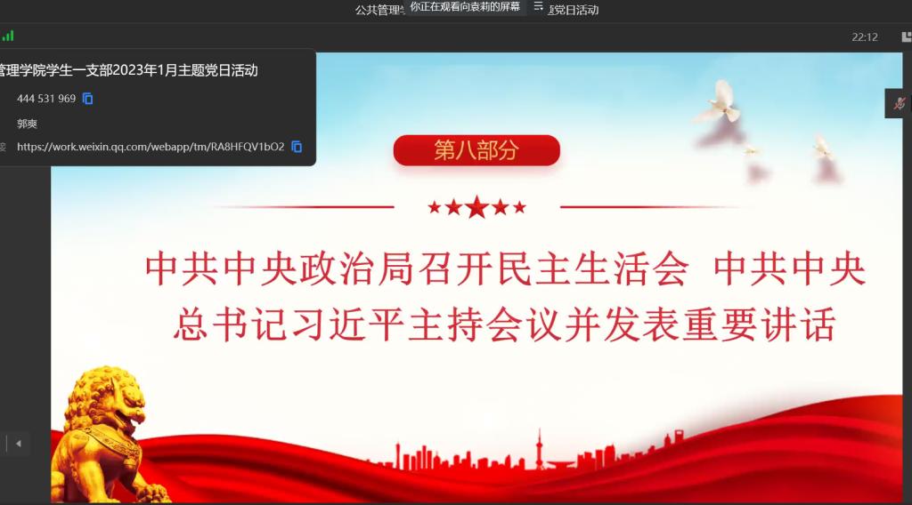 当前位置: 首页 >> 党建双创 >> 主题党日活动 >> 正文 英国365上市公司员工第一党支开展2023年1月份主题党日活动 时间:2023年01月13日 17:54 来源:英国365上市公司 郭爽 英国365上市公司员工第一党支开展2023年1月份主题党日活动 2023年1月13日,英国365上市公司员工第一党支部在企业微信以集中学习的方式开展了主题党日活动,本次活动应到27人,实到27人,本次活动由支部书记郭爽同志主持。 会议伊始,首先是由2019级龙钎君、向袁莉、邓明利、李心雨四位党员同志领学1月相关学习内容。其中,龙钎君同志领学了《中共中央政治局12月6日会议精神分析研究2023年经济工作研究部署党风廉政建设和反腐败工作》、《习近平在中共中央12月2日党外人士座谈会上的重要讲话精神》、《习近平总书记重要文章《继承和发扬党的优良革命传统和作风弘扬延安精神》(《求是》2022年第24期)、《习近平在《生物多样性公约》第十五次缔约方大会第二阶段高级别会议开幕式上的致辞》、《习近平在12月15日至16日中央经济工作会议上的重要讲话精神》的内容,向袁莉同志领学了《习近平总书记重要文章《谱写新时代中国宪法实践新篇章——纪念现行宪法公布施行40周年》》、《习近平在12月23日至24日中央农村工作会议上的重要讲话精神》、《习近平在中共中央政治局12月26日至27日民主生活会上的重要讲话精神》的内容,邓明利同志领学了《习近平在全国政协新年茶话会上的讲话》、《国家主席习近平发表二〇二三年新年贺词》、《习近平总书记重要文章《为实现党的二十大确定的目标任务而团结奋斗》》、《市委常委会12月9日会议精神学习贯彻习近平总书记重要讲话精神坚决维护党中央集中统一领导》的内容,李心雨同志领学了《市委六届二次全会会议精神 全面学习宣传贯彻党的二十大精神在新时代新征程为建设社会主义现代化新重庆而团结奋斗》、《市委常委会12月23日会议精神传达学习习近平总书记重要指示精神把全面实施宪法工作提高到新水平》、《市委理论学习中心组(扩大)1月3日深入学习贯彻党的二十大精神专题学习会议精神》的内容。 随后由陶友明同志分享了焦裕禄的藤椅的故事。焦裕禄以“生也沙丘,死也沙丘,父老生死系”的赤诚,以“心中装着全体人民、唯独没有他自己”的公仆情怀,诠释着亲民爱民、艰苦奋斗、科学求实、迎难而上、无私奉献的焦裕禄精神。焦裕禄去世了,但焦裕禄精神仍在延续。 所有领学完毕后,与会同志展开讨论。郑佳锐同志说,要落实产业帮扶政策,推动乡村产业全链条升级,增强市场竞争力和可持续发展能力。巩固拓展脱贫攻坚成果是全面推进乡村振兴的底线任务,要继续压紧压实责任,把脱贫人口和脱贫地区的帮扶政策衔接好、措施落到位,坚决防止出现整村整乡返贫现象。伍燕玲同志说同志要带头强化系统观念,提高政治站位,学习落实好党的方针政策。 最后,郭爽同志对自身一年来支部书记工作作了小结,对支部工作提出新要求,他提出在今后将会组织策划更多的支部活动,加强宣传与引导,吸引更多优秀的人才加入党支部,壮大支部人才队伍。在总结讲话中,他谈到新时代新征程我们应该树立新的目标,做德智体美劳全面发展的人,建设优秀的员工党支部,为公司公司发展做贡献。 上一条:英国365上市公司员工第一党支部召开2023年2月主题党日活动 下一条:英国365上市公司员工第一党支部召开2022年12月主题党日活动 【关闭】