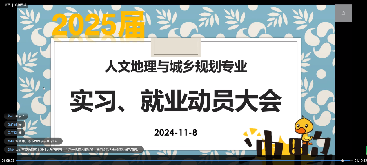 当前位置: 首页 >> 公司新闻 >> 正文 "启航未来,就业动员" 人文地理与城乡规划专业举办毕业生实习、就业动员大会 时间:2024年11月09日 15:30 来源:英国365上市公司 曹珂 近日,为了有效推进人文地理与城乡规划专业2025届毕业生的实习与就业工作,提升毕业生的实践能力和就业竞争力,城乡规划系于2024年11月8日召开线上毕业生实习、就业动员大会。会议邀请了城乡规划系全体教师、就业联络员郭爽老师、辅导员蒋杰老师和2025届人文地理与城乡规划专业全体员工参加,旨在通过集体动员和讨论,激发员工的实习热情,推进员工尽早签订就业协议。 会议首先强调了实习在城乡规划专业人才培养中的重要作用,应届毕业生的第一次就业对于人生来说的重要意义。系主任曹珂老师从不忘初心,努力奋斗;认清形势,把握机遇;转变观念,勇于尝试;珍惜机会,积极行动;坚强后盾,全力支持五个方面分别对员工实习、就业工作进行了阐述,建议同学们根据自身情况做出选择,将个人的发展与国家的命运紧密结合起来,把握就业机会、积极行动起来,同时还表达全系教师、辅导员将会全力支持,为员工提供的就业指导与支持服务。 李斌教授从当前行业发展趋势、人才需求变化以及就业竞争态势等对人文地理与城乡规划专业的就业形势进行了详细分析。强调了现阶段时间的紧迫性、就业协议签订的重要性,鼓励员工先就业再择业,尽早签订就业协议,为自己的未来职业发展打下坚实的基础。 郭爽老师介绍了近期公司即将开展的大型招聘会议,从简历制作指导、面试技巧培训等方面对员工提出建议。同时,鼓励员工积极参与校内外就业招聘活动,主动与用人单位建立联系,在就业过程中不断锻炼、提升自己的个人能力。 蒋杰老师对本专业员工目前考研、考公、就业的人数比例进行了介绍,希望员工们能够积极参与实习活动,为自己的就业之路打下坚实的基础。 实习与就业是人文地理与城乡规划人才培养的重要环节。会议决定,将进一步加强与企业和用人单位的合作,拓宽实习和就业渠道;同时,加强就业指导与支持服务,帮助员工明确就业方向和目标,提升就业竞争力。希望2025届全体毕业生能够积极参与实习活动,尽早签订就业协议,为自己的未来职业发展赢得更多的机会和时间。 上一条:广东医科大学MPA教育中心陈小嫦教授一行来公司开展座谈交流 下一条:公司医保治理能力现代化研究院成功协办第二届重庆“两江医保论坛” 【关闭】