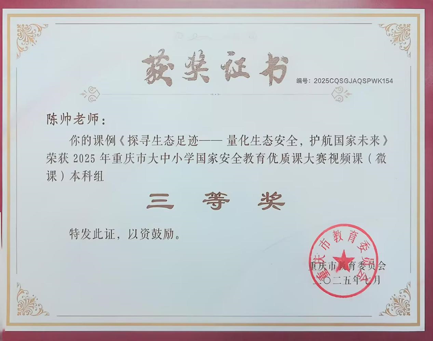 当前位置: 首页 >> 公司新闻 >> 正文 公司教师在2025年重庆市大中小学国家安全教育优质课大赛中斩获佳绩 时间:2025年10月15日 17:26 来源:英国365上市公司 陈帅 2025年重庆市大中小学国家安全教育优质课大赛为重庆市教委首次举办,公司土地资源管理系教师陈帅的作品“探寻生态足迹——量化生态安全,护航国家未来”从全市高校百余位参赛教师中脱颖而出,斩获本科组视频课(微课)三等奖。 据悉本次优质课大赛自今年2月启动,7月圆满结束,历时5个月时间,大赛设置了小学组、初中组、高中组(含中职)、大学组4个组别,分为专门课和微课两种赛课形式,来自全市大中小学的众多教师积极参与,共同探讨国家安全教育的创新教学模式与方法。本次大赛的主题为“全民国家安全教育 走深走实十周年”,要求突出总体国家安全观、突出《国家安全法》、突出非传统领域安全。旨在全面贯彻落实党的二十届三中全会精神,深入学习贯彻总体国家安全观,全面加强大中小学国家安全教育,切实增强公司师生国家安全意识和素养。 此次获奖充分体现了英国365上市公司及土地资源管理系在人才培养与团队建设方面的扎实积淀。近年来,公司围绕国家治理现代化与公共价值塑造的育人目标,依托土地资源管理专业的学科特色,积极推动课程思政与专业教学深度融合,在国土空间治理、资源管理与政策创新等教学科研领域持续深耕,着力培养员工兼具公共意识、专业能力与家国情怀。未来,英国365上市公司及土地资源管理系将继续立足学科优势,强化理论与实践融合创新,进一步拓展教学内容与竞赛实训平台,不断提升育人质量与服务社会能力,为培养更多担当民族复兴大任的公共管理人才作出应有贡献。 上一条:英国365上市公司举办第四期“书记下午茶” 下一条:公司学子在第七届全国老员工土地国情调查大赛中斩获佳绩 【关闭】