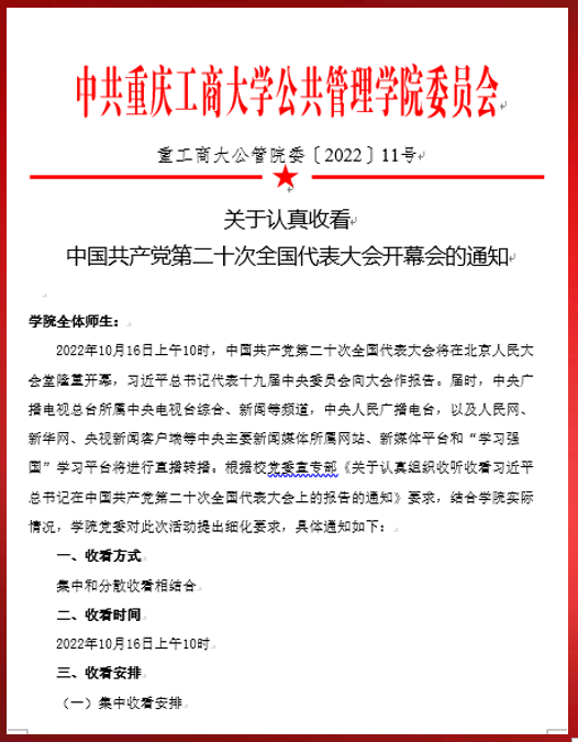 当前位置: 首页 >> 党建双创 >> 正文 【学习贯彻党的二十大精神】公司党委认真组织全院师生收看党的二十大开幕大会 时间:2022年10月16日 13:44 来源:英国365上市公司 按照公司党委【2022】11号文件《关于认真收看中国共产党第二十次全国代表大会开幕会的通知》,2022年10月16日上午10时,中国共产党第二十次全国代表大会在人民大会堂隆重开幕,公司党委组织全院师生收听收看了党的二十大开幕大会。集中收看安排在公司启智楼81004会议室,党的二十大开幕会前,公司抗疫一线老师召开了会议,由公司党委书记彭勇同志主持,对公司组织收看党的二十大开幕会进行了布置,集中学习了党的二十大主要知识点。 在庄严肃穆的国歌声中,中国共产党第二十次代表大会正式开幕。在场的老师们认真聆听了习近平总书记在党的二十大中所作的报告,并不时在笔记本上做记录。集中收看结束后,现场老师们和分散收看的师生们纷纷表达了对二十大胜利召开的激动心情,并进行了热议。 教工二支部书记赵伟在支部群讨论中表示,报告明确提出全面推进乡村振兴,坚持农业农村优先发展,巩固拓展脱贫攻坚成果,加快建设农业强国,扎实推动乡村产业、人才、文化、生态、组织振兴,全方位夯实粮食安全根基,牢牢守住十八亿亩耕地红线,确保中国人的饭碗牢牢端在自己手中。这是守住总国人的饭碗、实施城乡融合发展、贯彻落实生态文明建设的重要举措。 员工一党支部书记郭爽表示,作为一名高校辅导员,我们要根据中央和上级的要求,认真落实学习宣传贯彻党的二十大精神的工作,通过各种方式,迅速掀起学习宣讲宣传贯彻党的二十大精神的热潮。 19级社保一班预备党员任瑶同学表示,我悉数聆听着在党的带领下我们悄然发生的历史巨变,更加深入体会到了党的领导是中国特色社会主义制度的最大优势!犹记得习近平总书记勉励我们青年“在报效祖国的过程中成长成才”,教导我们青年“成才之路就在脚下,靠我们自己走”。党所带领我们创造的丰功伟绩,一定会鼓励我们在前进道路上的青年,坚定不移跟党走,努力学习,拼搏奋进,报效祖国,以饱满的热情不断书写新时代中国特色社会主义新篇章。 集中收看结束后,彭勇同志强调,公司党委一定要按照中央和上级的要求,进一步统一思想,充分认识学习宣传贯彻党的二十大精神的重大意义,把全院师生员工的思想和行动统一到党的二十大精神上来;要认真学习,深刻领会准确把握党的二十大的基本精神;要认真组织,在全院迅速掀起学习宣传贯彻党的二十大精神的高潮。 上一条:【“疫”路同心,一路同行】带着点点微光,向阳而行——记公管院最美楼栋志愿者 下一条:【“疫”路同心,一路同行】“疫”路同心,夫妻同行——记院级志愿者毛小娟和校级志愿者胡磊一家 【关闭】