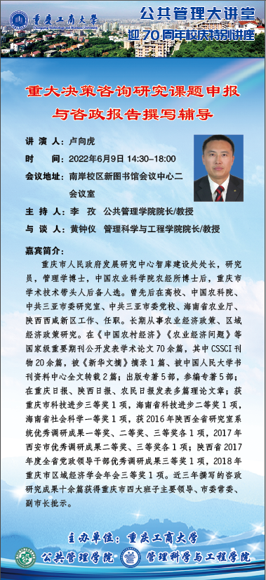 当前位置: 首页 >> 科学研究 >> 学术讲座 >> 正文 公共管理大讲堂(迎70周年校庆特别讲座)——重大决策咨询研究课题申报与咨政报告撰写辅导 时间:2022年06月08日 14:24 来源:英国365上市公司 上一条:公共管理大讲堂——延迟法定退休年龄问题的战略与战术思考 下一条:公共管理大讲堂(迎70周年校庆特别讲座)——中国共产党社会保障政策的目标选择及其实践取向 【关闭】
