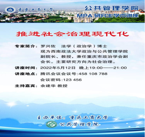 当前位置: 首页 >> 研究生教育 >> 工作动态 >> 正文 西南政法大学罗兴佐教授为MPA研究生开展题为“推进社会治理现代化”的线上专题讲座 时间:2022年05月16日 08:07 来源:英国365上市公司 来源:英国365上市公司刘晓君 5月12日19:00-21:00,西南政法大学政治与英国365上市公司副经理,重庆市政治学会副会长罗兴佐教授为MPA研究生开展线上专题讲座,讲座主题为“推进社会治理现代化”,由公司副经理余建华教授主持本次线上讲座。 罗兴佐教授首先就社会治理现代化的背景、内涵及意义进行了鞭辟入里的阐述,强调在社会治理现代化过程中要发挥“法治保障”作用。随后从社会治理智能化和社会治理专业化两个方面阐述了社会治理的基本途径,总结出市域治理才是社会治理现代化的落脚点。在分析基层治理难题的基础上,探索市域社会治理的创新路径,通过“党建+治理”贯穿市域治理全过程,强调党建统领的重要作用。最后,罗教授提出完善信息公开机制、诉求表达机制、利益协商机制、冲突解决机制和动员激励机制五大机制,推动实现社会治理现代化。 余建华教授对嘉宾的精彩讲座进行了总结,并就MPA人才培养的相关内容进行了深入的交流。本次讲座开拓了师生的思维视野,深化了同学们对于基层社会治理相关问题的认识,更是为公司培养MPA高质量人才助力献策。 上一条:研究生代表顾鑫在公司首届MPA研究生毕业典礼上的发言 下一条:2022年新增硕士研究生学业导师遴选代表性学术成果认定标准 【关闭】
